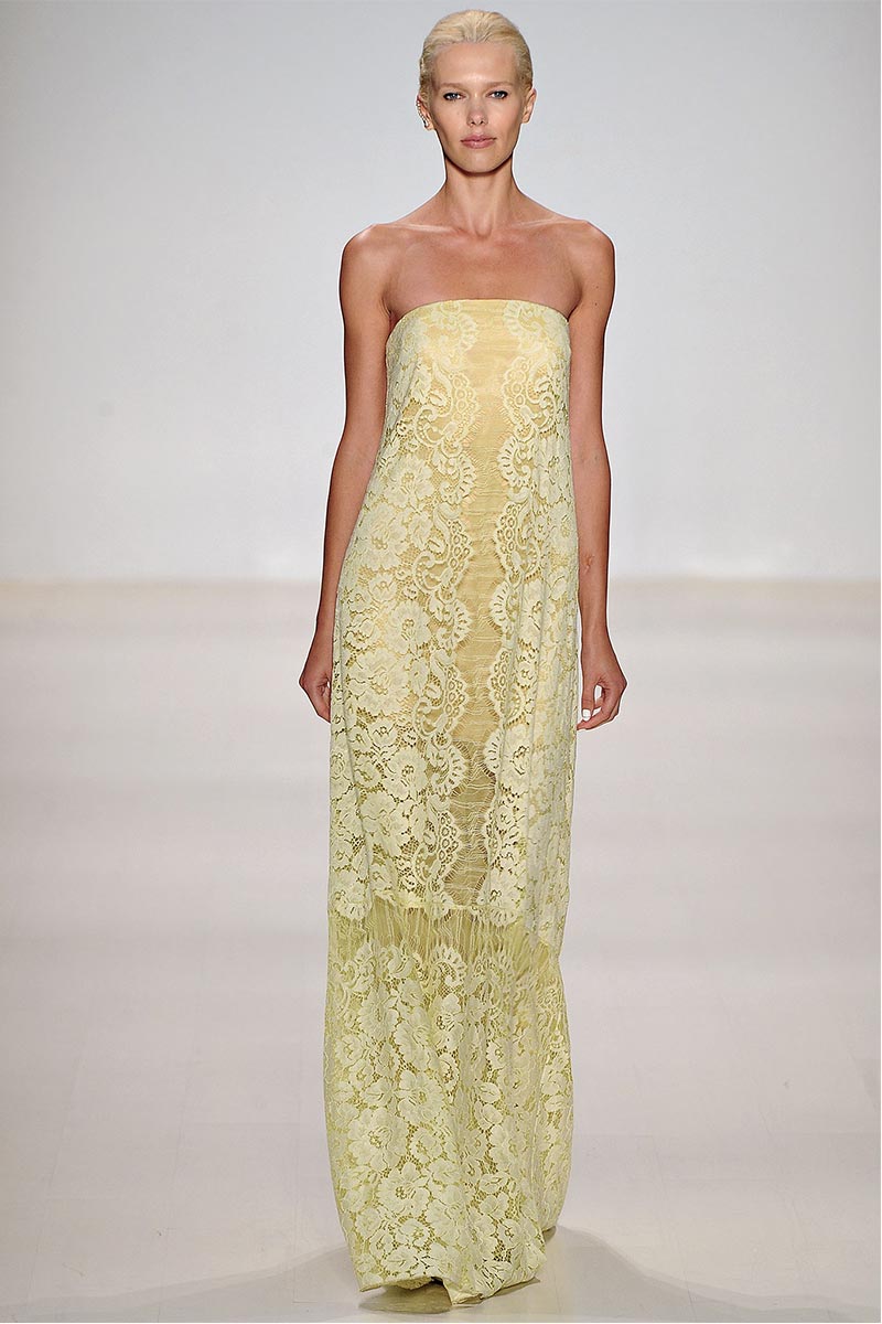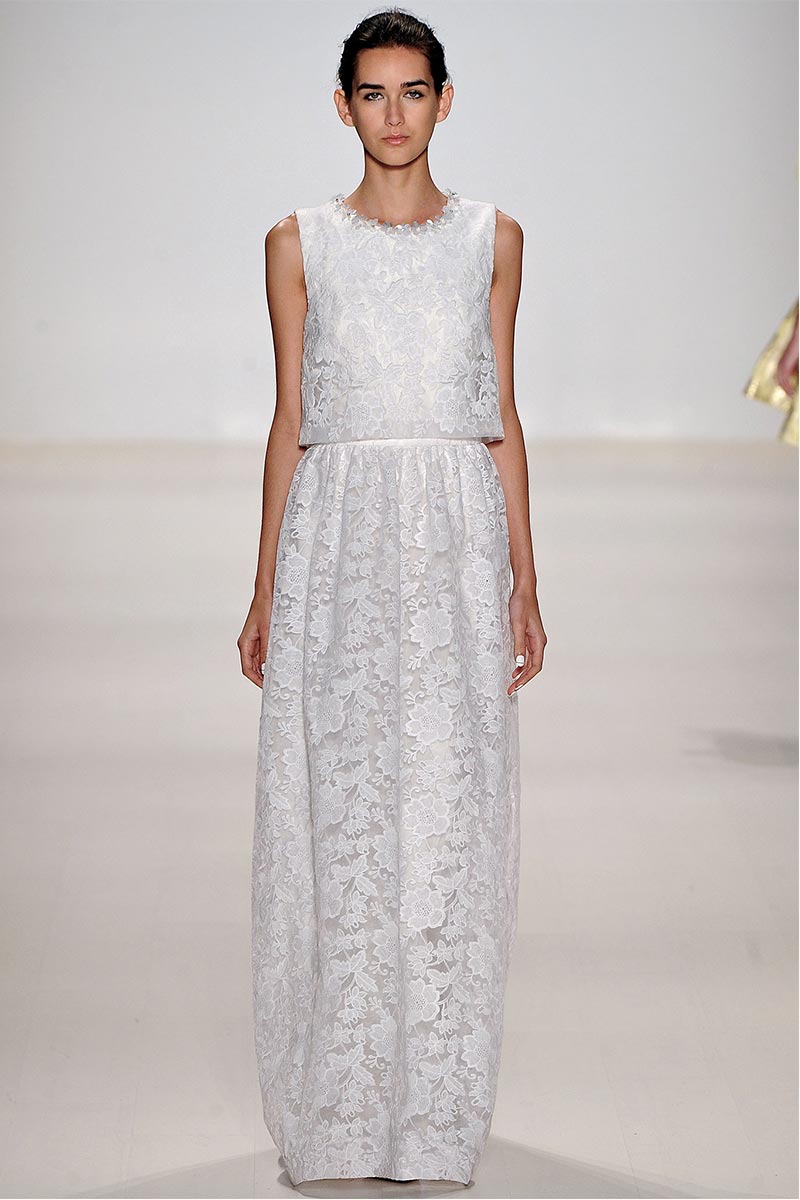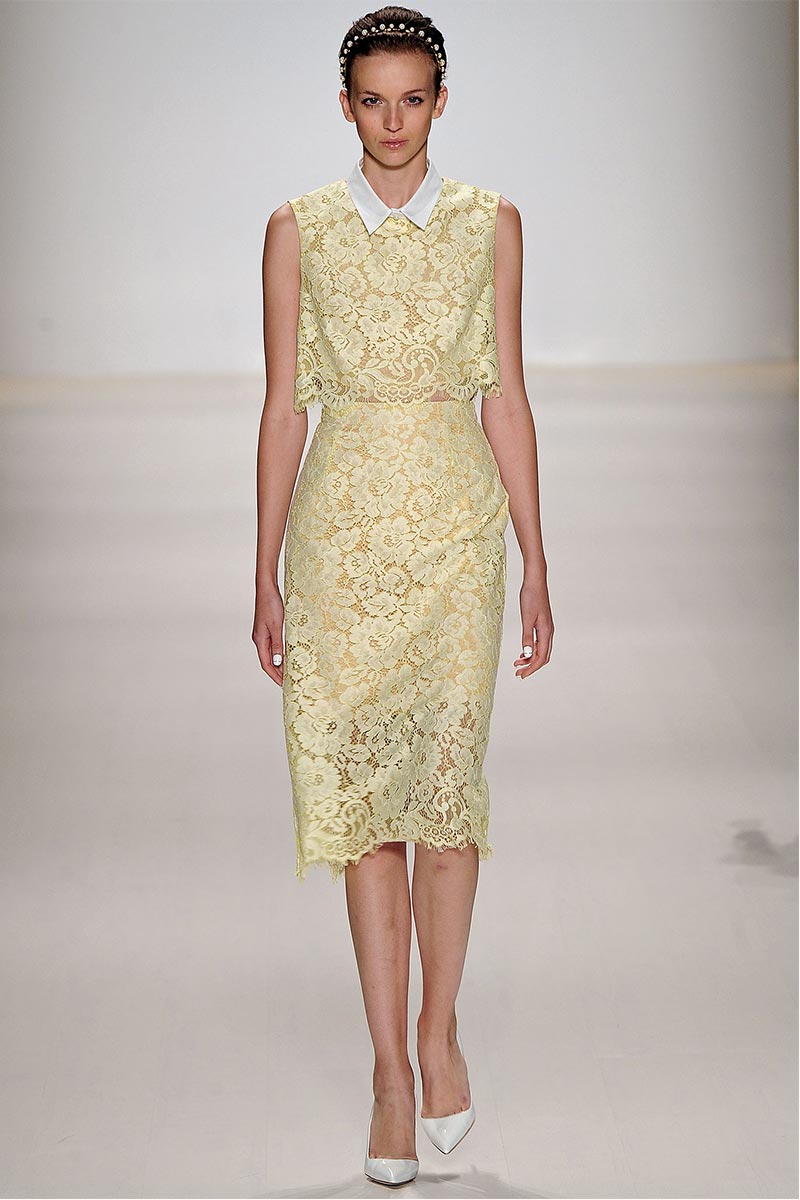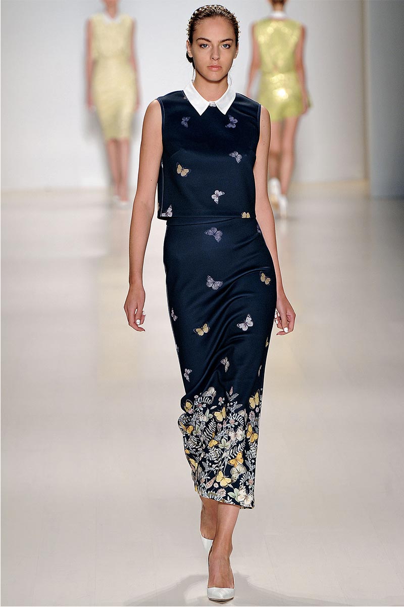 Charmed, I’m sure … Why yes! I definitely was when Erin Fetherston’s spring collection graced the runway. For a few seasons she has shown her designs in presentations; however, this season she wanted to see our expression as her collection did the moving around. And let me tell you, I fell in love. From the moment that pristine white neoprene crop top and almost ankle-length green and pink floral print neoprene skirt hit the catwalk, I salivated, and I’m not even a woman!