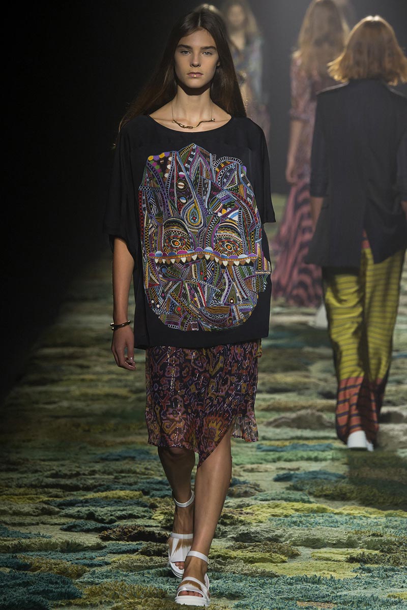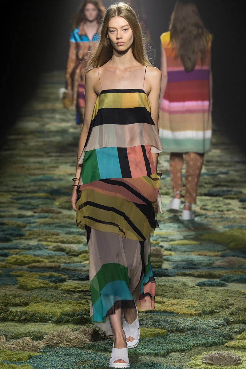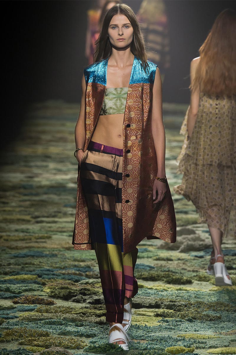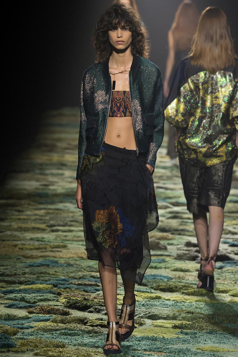 The grass tickled my bare feet and wind softly blew on my face as I skipped through the lush verdant untouched forest trying to find the perfect spot to settle down with my oversized blanket. Hypnotized by a sweet fragrance, I laid my blanket out and took a seat by a fallen trunk with wild flowers blooming out of its decaying orifice. All around me large, rich pillars loomed above me to a majestic canopy. Cracks of light broke through in a golden stream from the heavens and kissed parts of a multitoned moss filled trail outlined by robust trunks, wild flowers, and… I quickly smacked myself into reality and focused on the clothes peacefully gracing the runway. Dries Van Noten has always been successful in transporting his spectators to a different world with his settings through use of music, lighting, and props. This year was no different, with the sound of birds chirping and the blowing of gentle winds playing in the background, along with a custom made carpet by Argentinean artist Alexandra Kehayoglou mimicking a moss trail, and dusky golden lighting mimicking sunlight seeping through a dense canopy, it was no surprise my enchanted senses placed me in a lush dreamlike forest for the show.