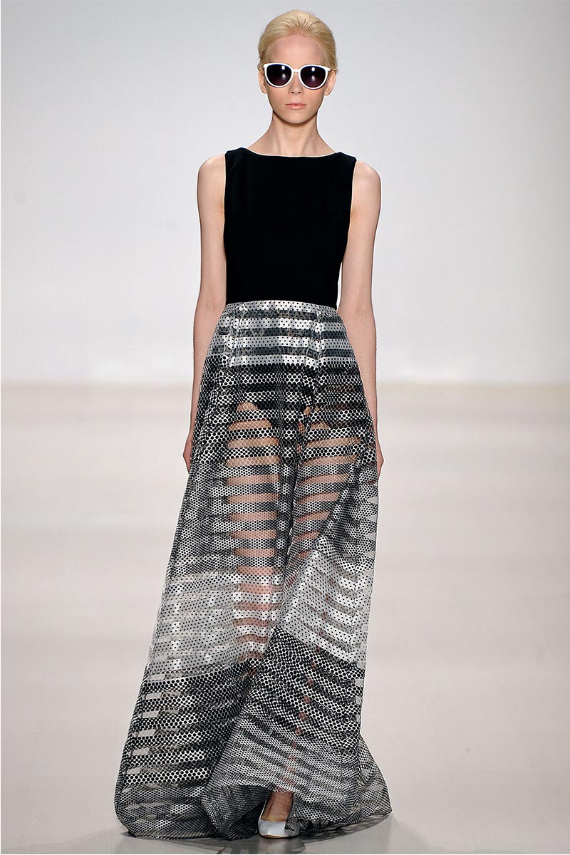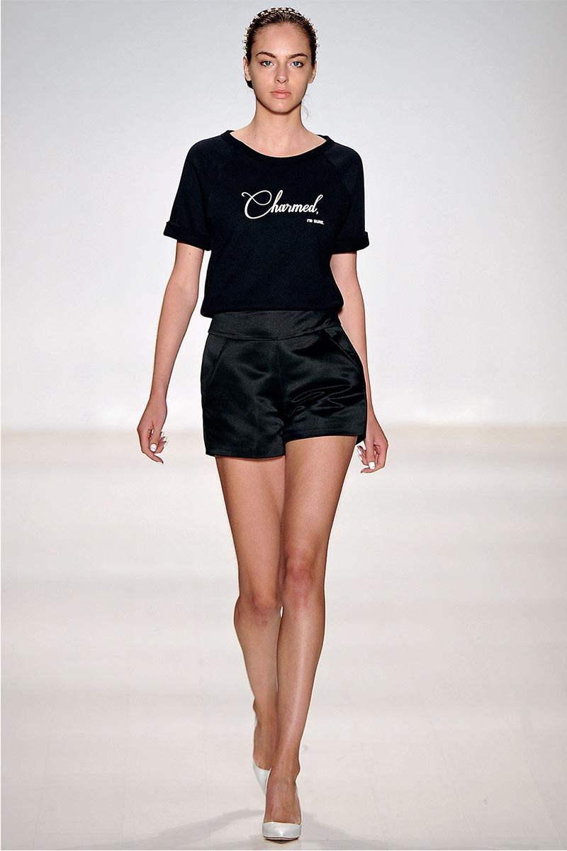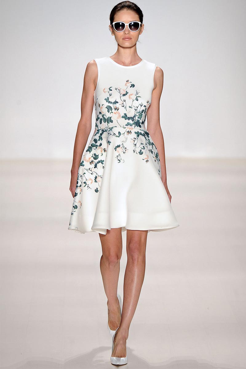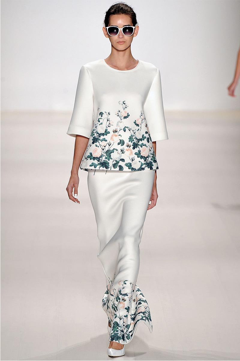 Charmed, I’m sure … Why yes! I definitely was when Erin Fetherston’s spring collection graced the runway. For a few seasons she has shown her designs in presentations; however, this season she wanted to see our expression as her collection did the moving around. And let me tell you, I fell in love. From the moment that pristine white neoprene crop top and almost ankle-length green and pink floral print neoprene skirt hit the catwalk, I salivated, and I’m not even a woman!