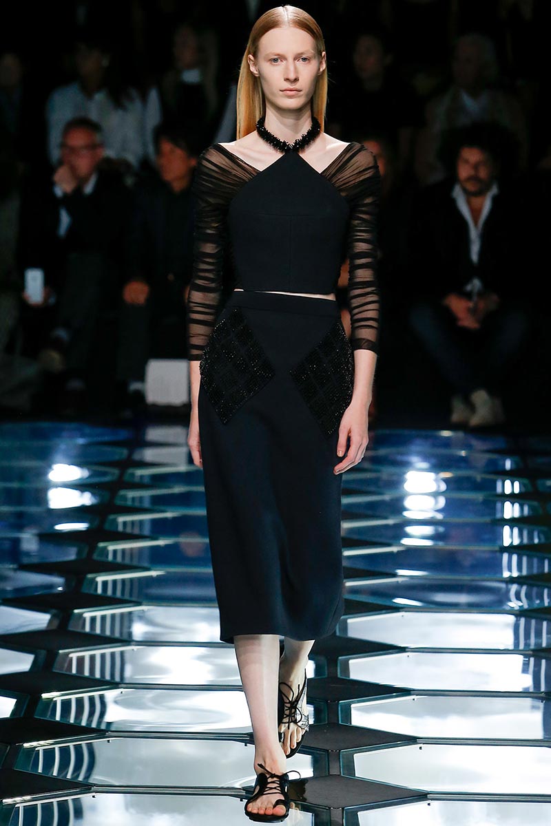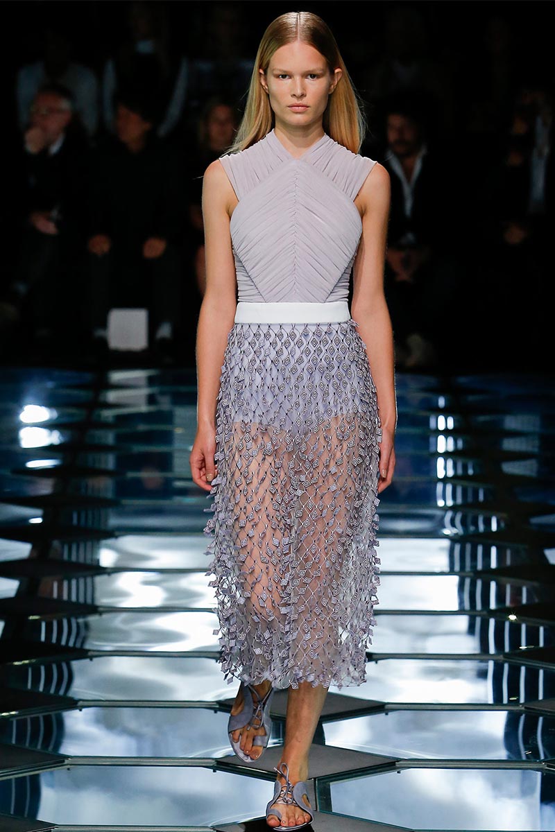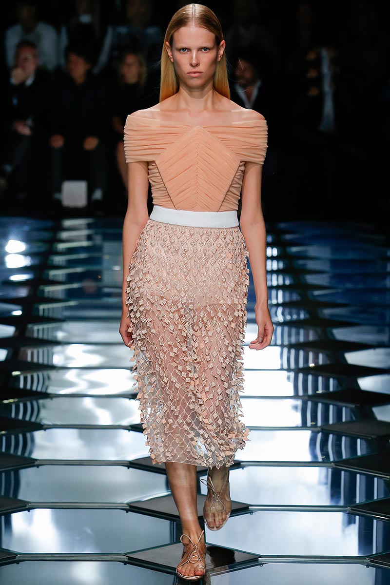 Dense techniques of embellishment married the opulence and exuberance that Wang wanted to accomplish within the austere-purity of the house archives, giving as result tone-on-tone decorations that upraised the casual aspect of the pieces. Likewise, details like the arresting dynamic-movement seen on the skirts with little rhombic fabric-tiles stitched over the same sheer, geometric-pattern, indicate craftsmanship as new addition into Wang's new language for Balenciaga. That attention to precision is evident in the way the aforementioned little rhombic-shapes were laser cut-out-of organza, leaving negative spaces that were intricately beaded to offer tridimensionality. The beaded work in lattice pattern, used for a long-sleeve top with strapless-corset overlay as one piece (that model Hanne Gaby sported towards the end), was also a clear-cut.