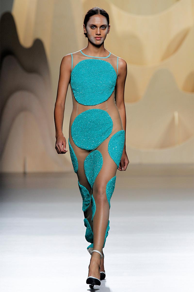Una propuesta donde como nos tiene acostumbrados, su inclinación por lo geométrico fue latente. En este caso sobresalieron los grandes círculos que se adherían  en seductores vestidos resaltando la maravillosa transparencia Georgette. El juego y la mezcla de texturas es sin duda la apuesta mas acertada actualmente en la moda y el Demi-Couture es uno de los fuertes de la diseñadora que fusiona muy bien  la creatividad, los sentidos y el arte con la fabricación de cada pieza. Tules bordados a mano con rafia, brillos en el needlepoint mas moderno, fluidas sedas, Crepés y los Tecno-Neoprenos daban estructura a los Bombers, fuerza a las Sudaderas,  y cuerpo a  las minifaldas de volantes algunas acompañadas por el tan idolatrado y veraniego Crooped Top.